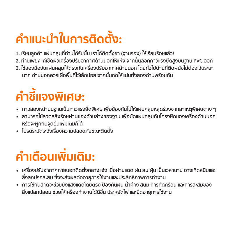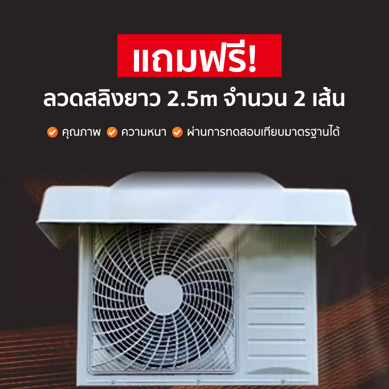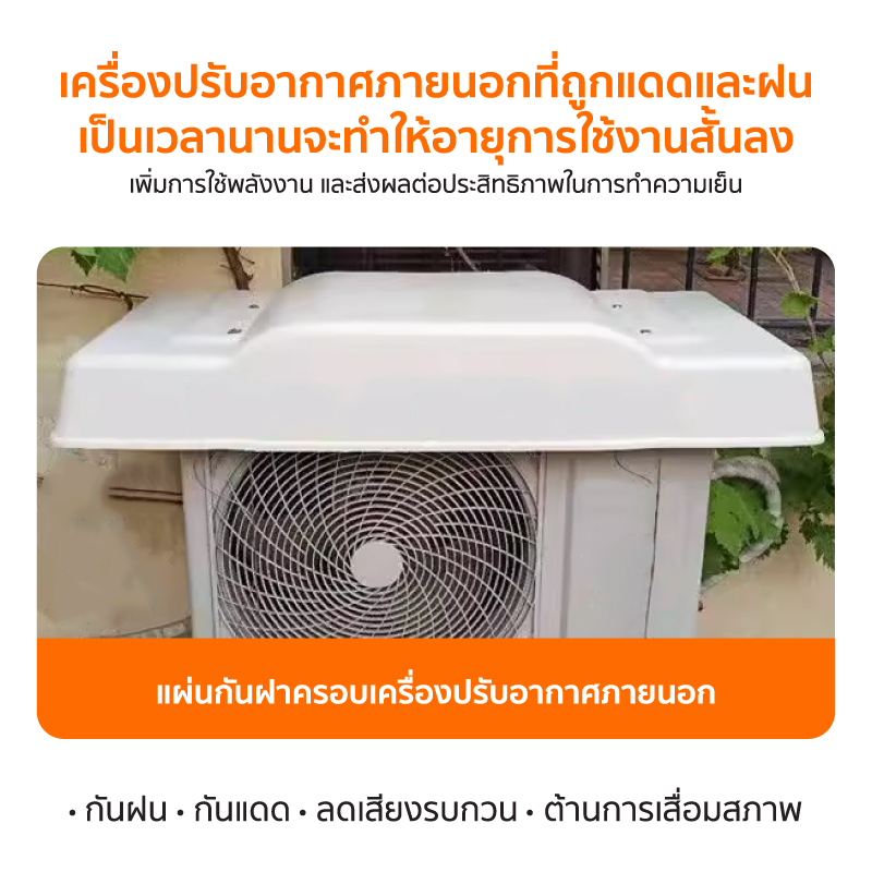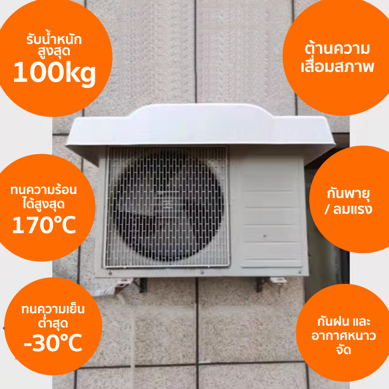 แผ่นกันฝาครอบเครื่องปรับอากาศภายนอก เครื่องปรับอากาศภายนอกที่ถูกแดดและฝนเป็นเวลานานจะทำให้อายุการใช้งานสั้นลง เพิ่มการใช้พลังงาน และส่งผลต่อประสิทธิภาพในการทำความเย็น รับน้ำหนักสูงสุด 100kg ทนความร้อนได้สูงสุด 170°C แถมฟรี! ลวดสลิงยาว 2.5m จำนวน 2 เส้น